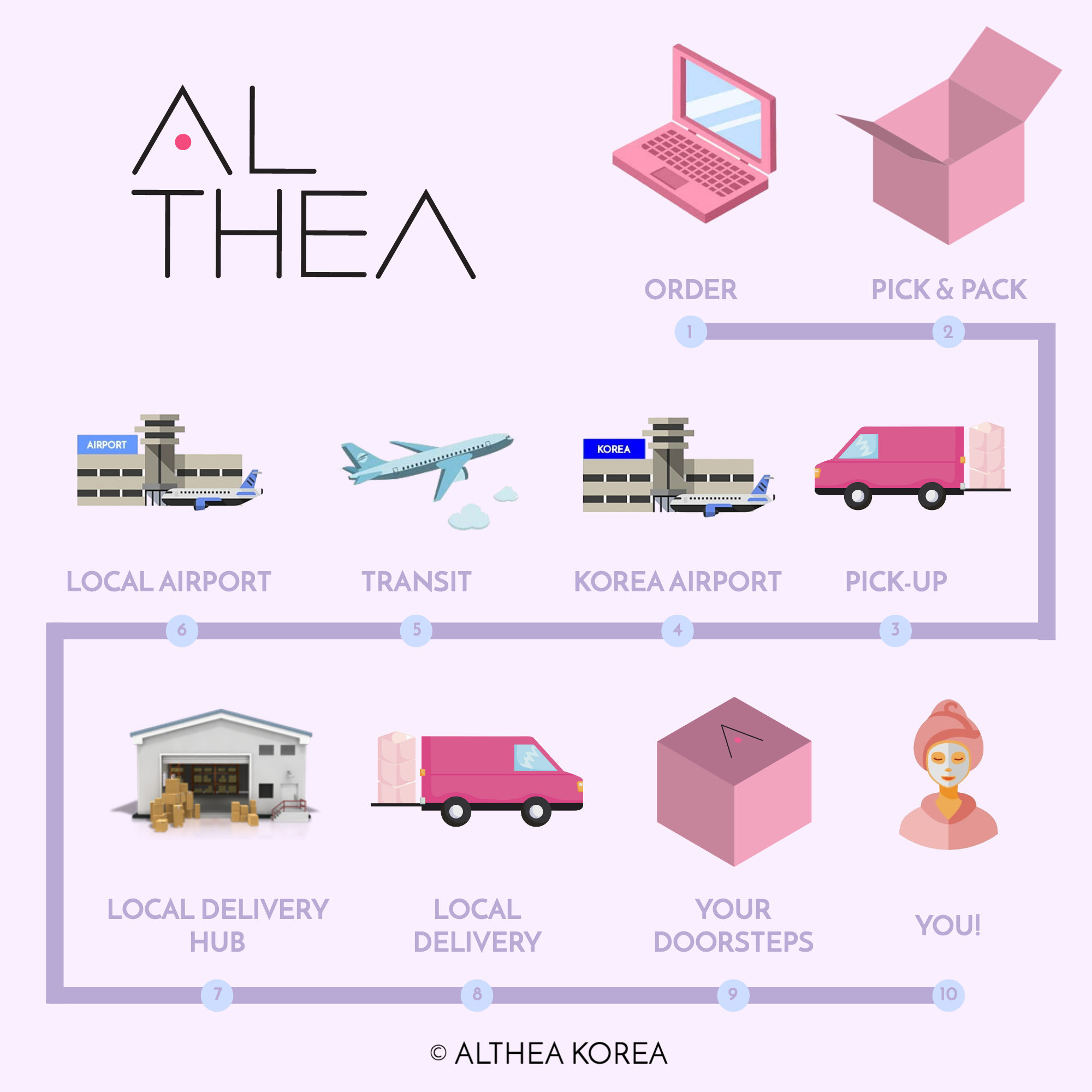 After placing an order on Althea, you will receive an order confirmation e-mail from Althea. Our fulfillment center in Seoul will then begin to pick and pack your order into Althea Box/Althea Air so your order will arrive safely and in good condition to you.
